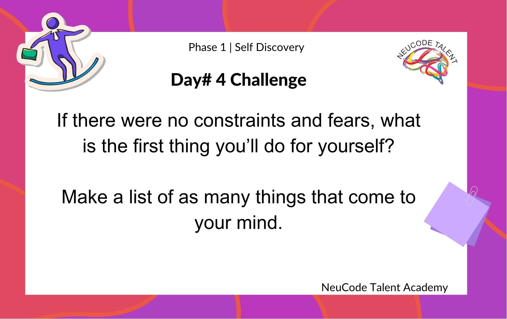 By engaging in these daily challenges, you’ll tap into the power of your own mind and emotions, allowing you to break free from self-doubt and negative self-perception.